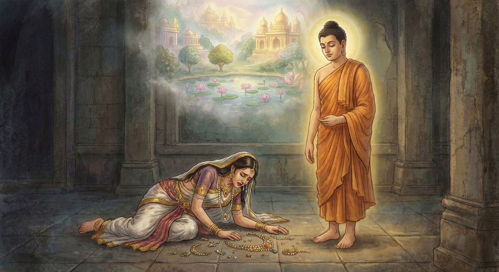 そんなある日、彼女は遥か彼方の霊鷲山(りょうじゅせん)に向かって礼拝し、涙ながらにこう祈ります。