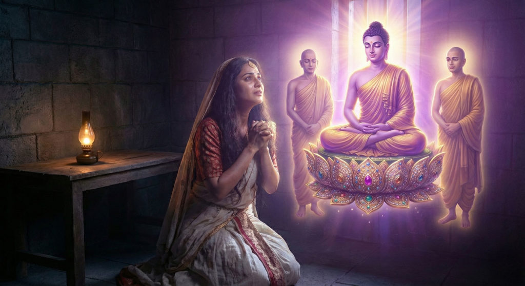 「お釈迦様、どうか私のもとへ、お弟子の目連(もくれん)様と阿難(あなん)様を遣わしてください。彼らに会って、慰めてもらいたいのです」