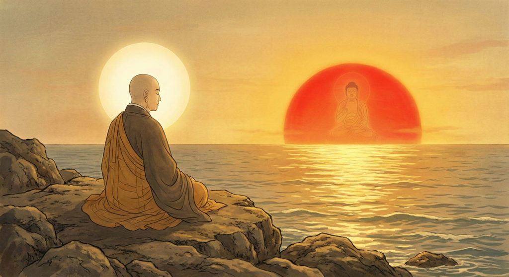 お釈迦様はこう仰いました。「まず西の空に沈みゆく太陽を見なさい。そして目を閉じても、開いていても、その太陽が目の前にあるかのようにありありと思い浮かべなさい」。
